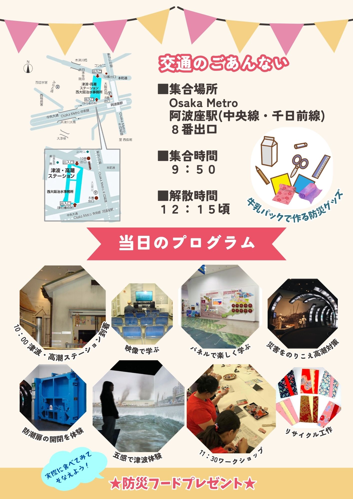 スケジュール 午前9時50分 阿波座駅8番出口集合→午前10時00分頃 津波・高潮ステーション到着(映像で学ぶ・パネルで楽しく学ぶ・災害をのりこえ高潮対策・防潮扉の開閉体験・五感で津波体験)→午前11時30分頃 大阪府立江之子島文化芸術創造センター到着(牛乳パックでリサイクル防災グッズ工作・防災フードプレゼント)→午後0時15分頃 解散