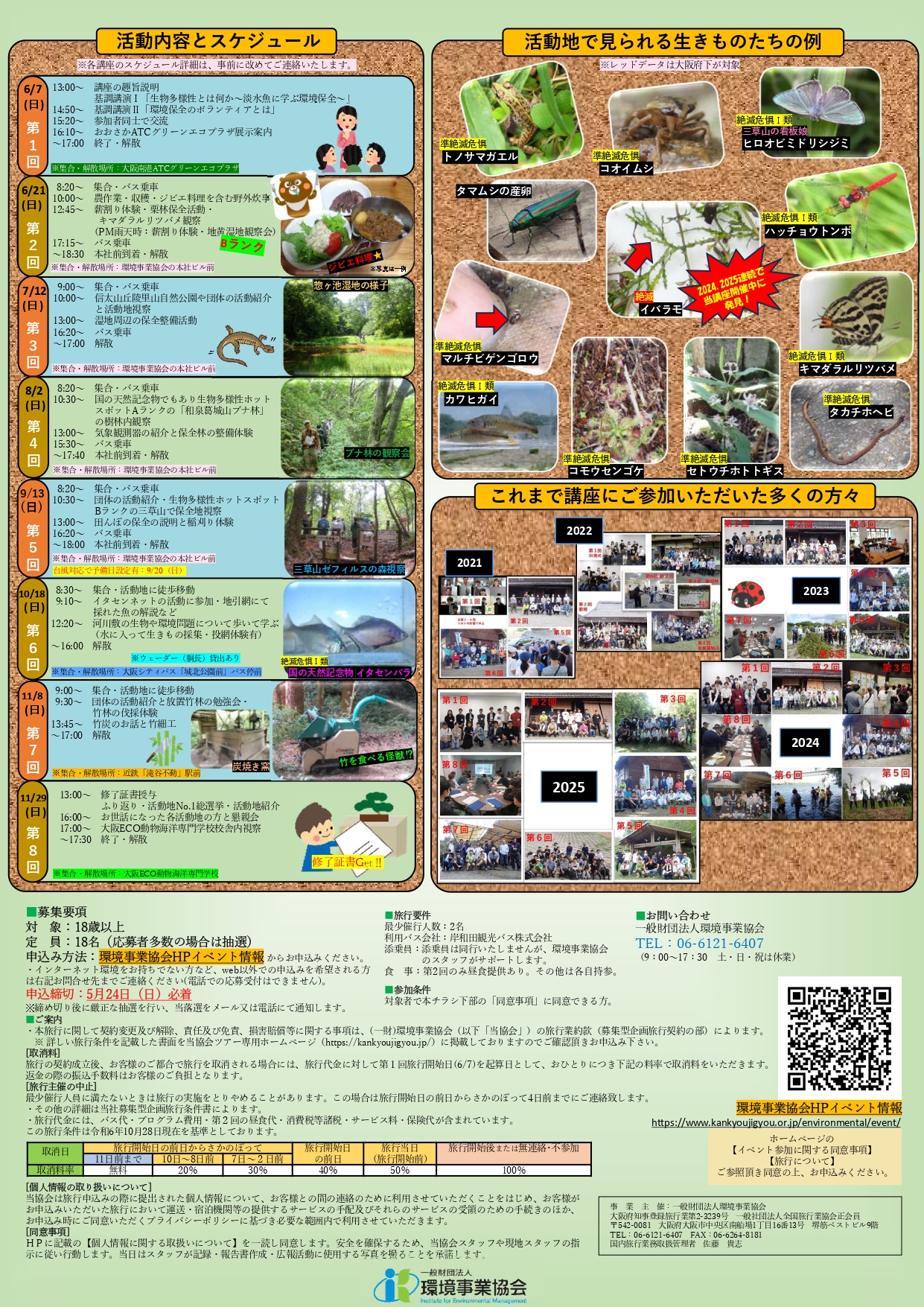今年で6年目となるこのシリーズ講座では、大阪府近郊で自然環境保全の活動をしている団体の活動地を北から南まで訪問し、森林、川、湿地、里山の保全活動に参加、自身にあった活動を検討してもらい、講座終了後もそういった活動に目を向けて保全に繋がる運動をしてもらえるよう導きます☆彡