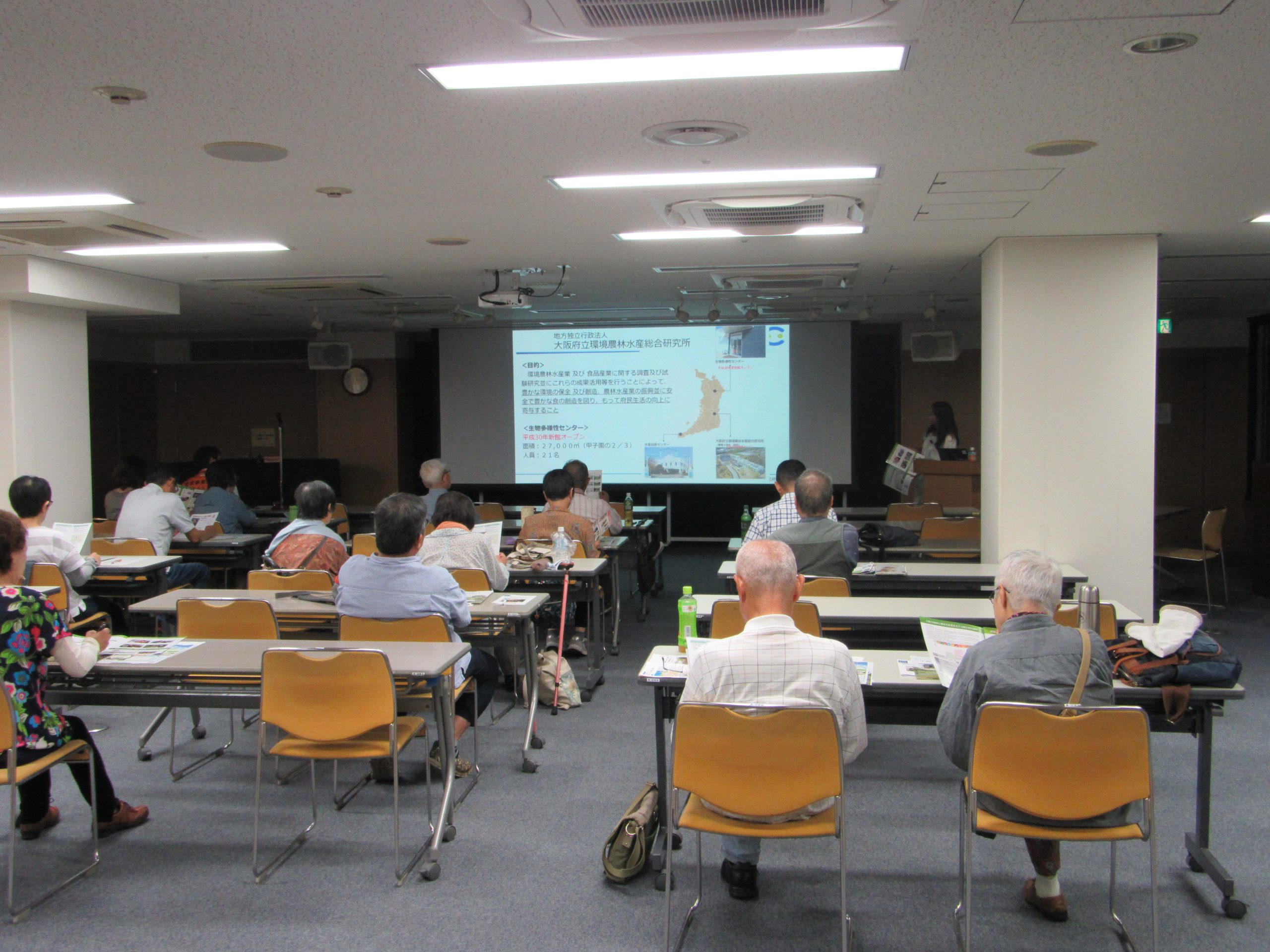今話題の外来生物は、海外から持ち込まれた生物だけでなく、国内の他の地域から持ち込まれた国内外来生物もあることなどを身近な生物「メダカ」などを例にお話され、受講者の皆さんも興味深く聞いていました。後半では生物多様性センターで行っているさまざまな調査研究から、大阪で今生物多様性に関するどんな問題が起きているのかについてご紹介いただきました。