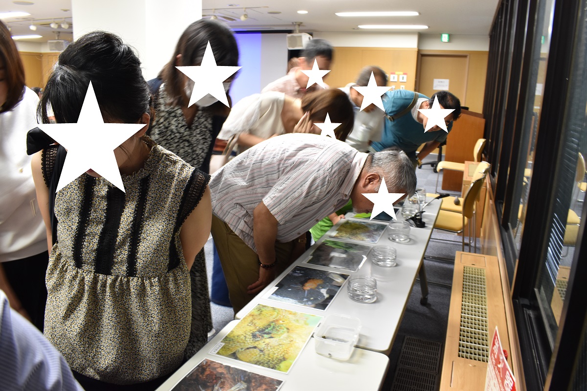 実物の多彩なウミウシの生体をたくさんの方が覗き込んでみておられました。第2部では「ウミウシから見る大阪湾の生物多様性」としてきしわだ自然資料館の柏尾 翔先生にご講演いただきました。