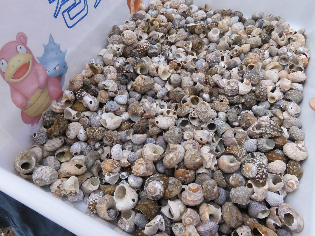 最も多かったのは巻貝でした。イシダタミ・クボガイ・スガイなどをはじめとした磯の貝類が多い中、タカラガイの仲間も見つけてくれた子もいました。