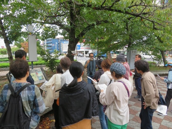 同区役所前にある[江戸時代の大正区の風景]という案内板の前で、江戸時代から現在に至るまでの地形のお話をしていただきました。